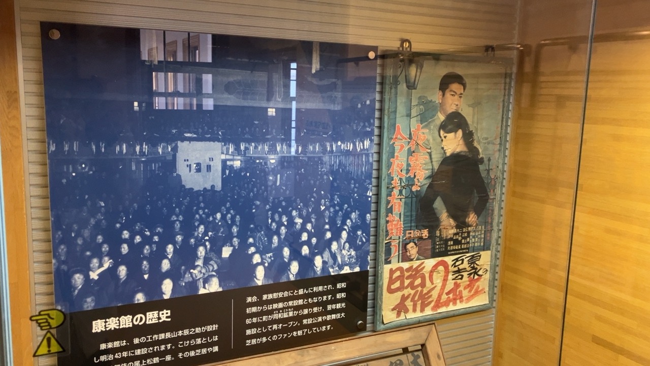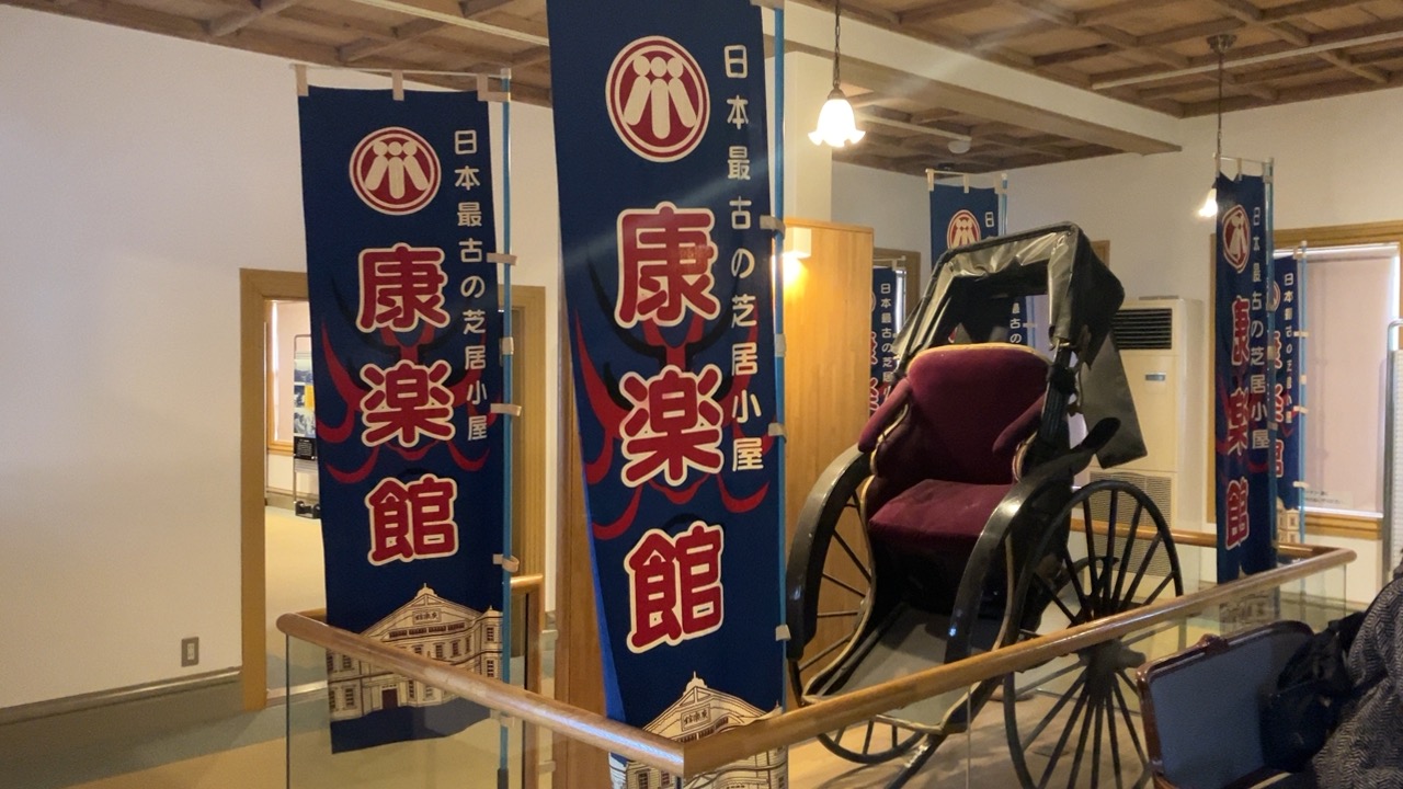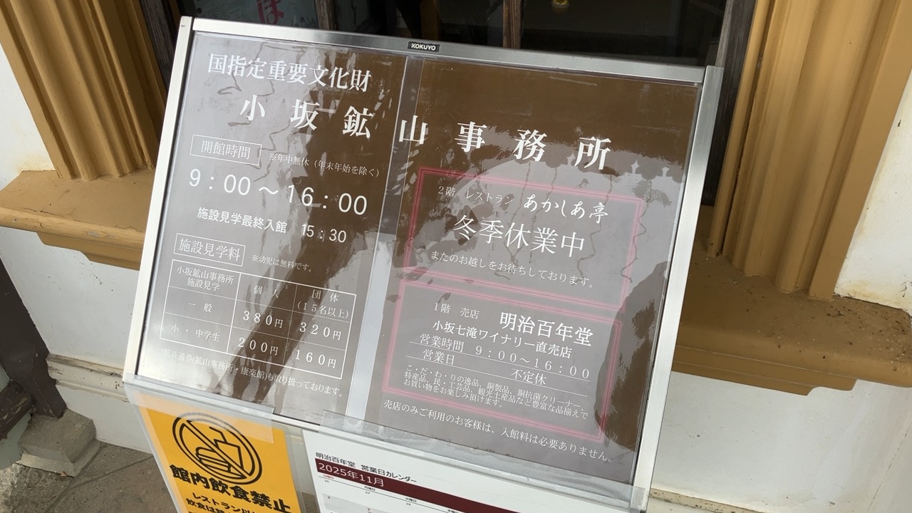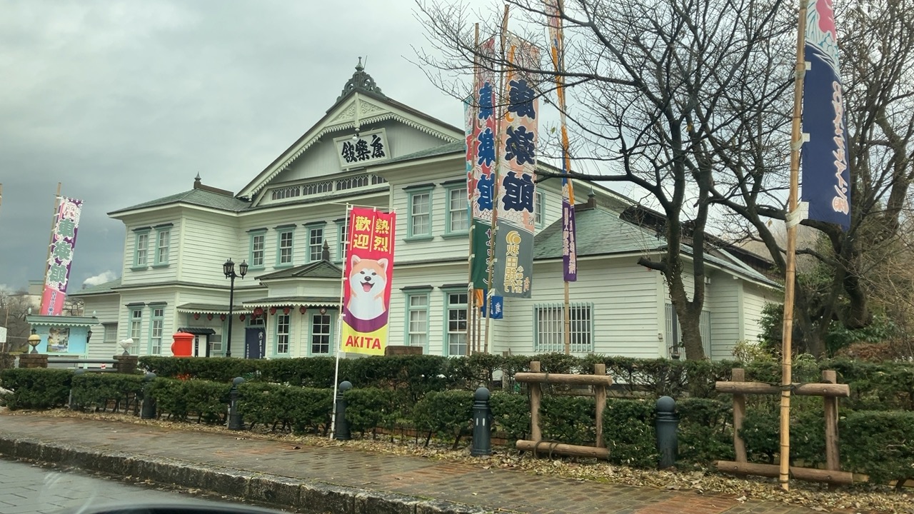 こちらが国指定重要建物面積は232.30坪、定員は607名、木造2階建て(一部地下一階)、アメリカ木造ゴシック風建築で文化財の康楽館です。明治時代の芝居小屋で小坂鉱山の繁栄と鉱山町の遺構としてとても貴重な建物です。こちらでは今でも芝居をしているのですが、令和7年の公演は2025年10月28日で終わっているため、この日の公演はありませんでした。