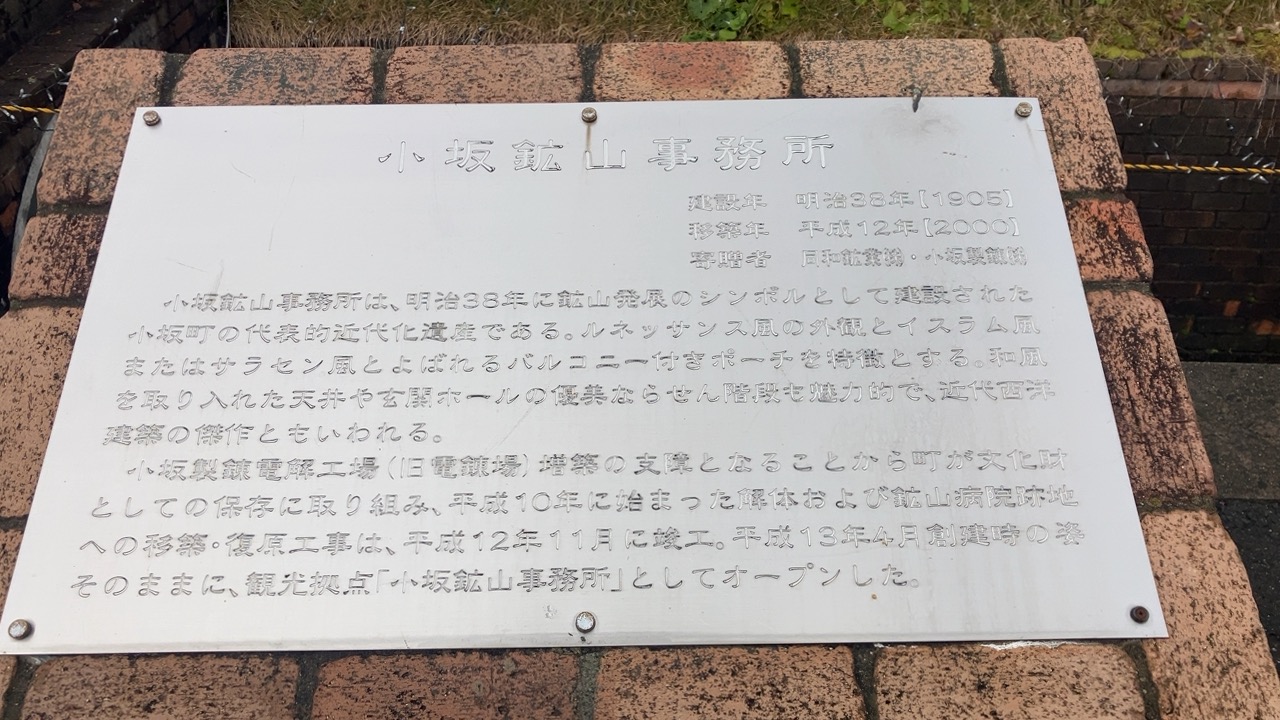1905年に藤田組小坂鉱山の本部事務所として建設されました。その後、1997年まで事務所として使われていましたが、工場増築に伴い解体、小坂町に無償譲渡されました。2001年に小坂町の明治百年通り構想に伴い旧小坂鉱山病院跡地に移築されて現在に至っています。