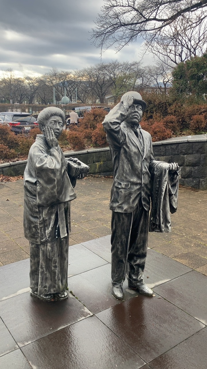 旧小坂鉱山事務所を見上げるブロンズ像が設置されています。