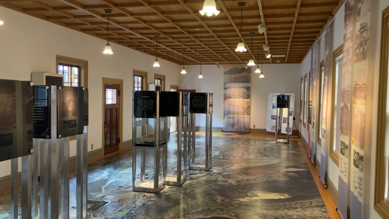 小坂の街の地図が床面にあり、各スポットに説明のための案内板が立っています。小坂の全体像を理解することができます。
