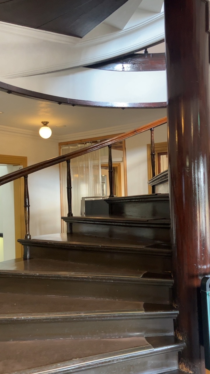小坂鉱山事務所ではウェディングドレスやイブニングドレスなど、いろいろな衣装を貸し出してくれます。この螺旋階段など、事務所内のいろいろな場所で記念写真を撮ることができます。