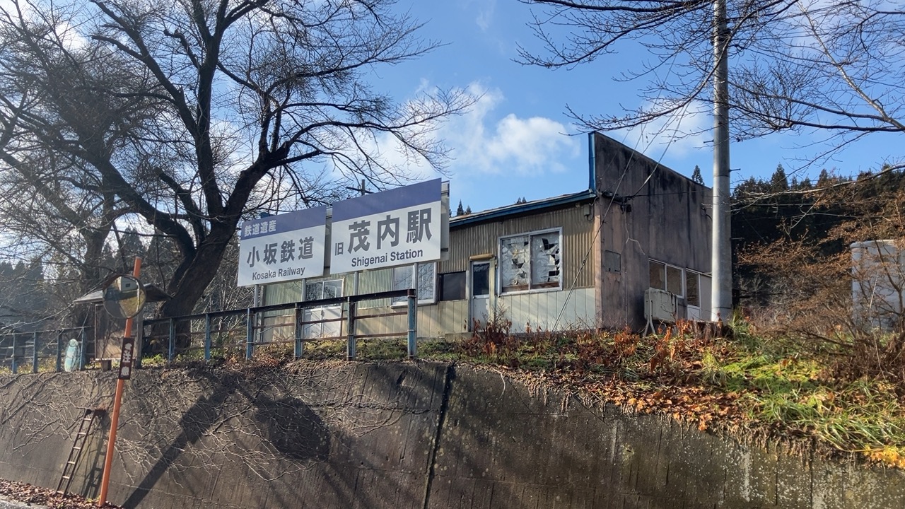 小坂町をあとにして、大館駅へと向かいました。この道は旧小坂鉄道に並行する道です。廃線跡が残っていることがよく分かりました。こちらは列車交換もできた茂内駅の遺構です。こちらの駅には軌間を1,067mmにしたあとのホームと、ナローゲージだったときのホームの両方が残っているとのことです。ただし、現在は立ち入り禁止になっていますので駅構内に入ることは出来ません。