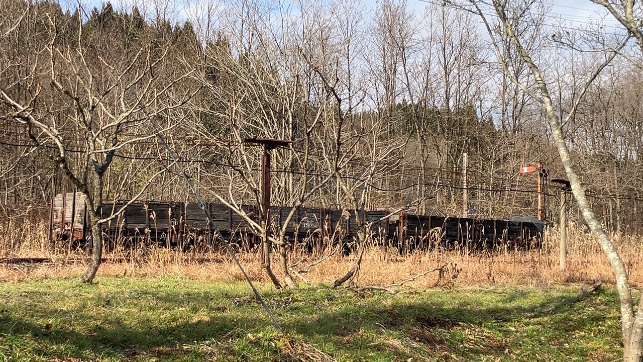 貨車の手前にTの字の柱がありますが、ここには腕木式信号機や転轍機(ポイント)を操作するためのワイヤーが通されています。雪国では地表面にワイヤーを通すと降雪により動作しなくなってしまうので、このように高いところを通しているのだそうです。