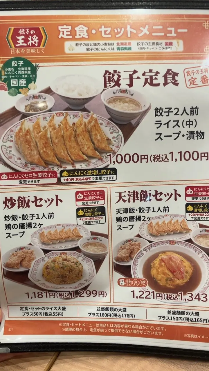 こちらは餃子定食です。ほかのお店で言うと、ダブル餃子定食に相当します。こちらが税込1100円です。