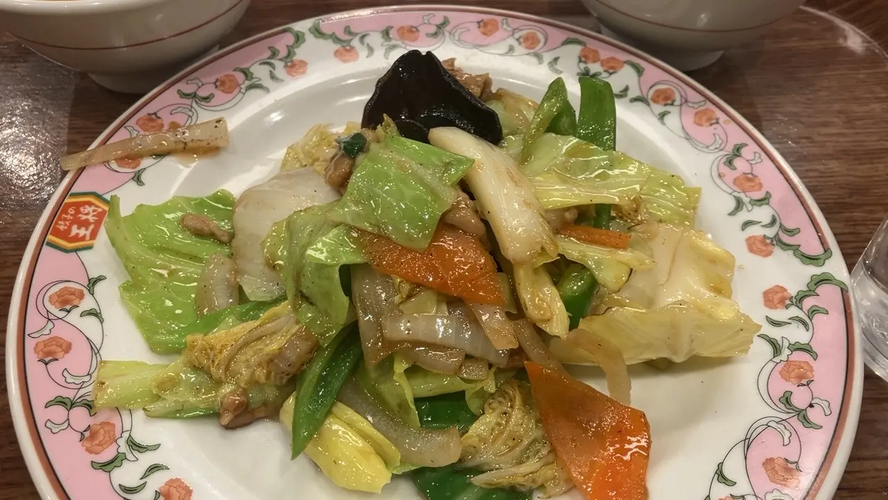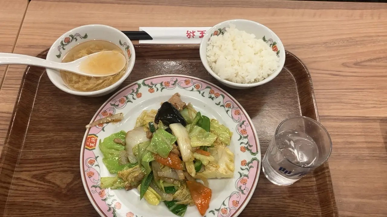 こちらは単品の野菜炒めにご飯とスープを組み合わせて、定食にしたものです。餃子がついてくる、メニュー上の定食と比較すると、注文に手間がかかりますが、リーズナブルな価格です。