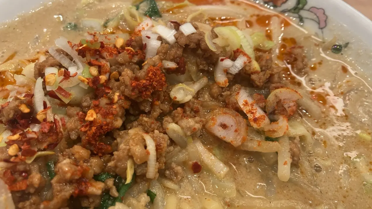 スープにはラー油が漂っているほか、上からは赤くて辛そうな粉がかけられていることが分かります。