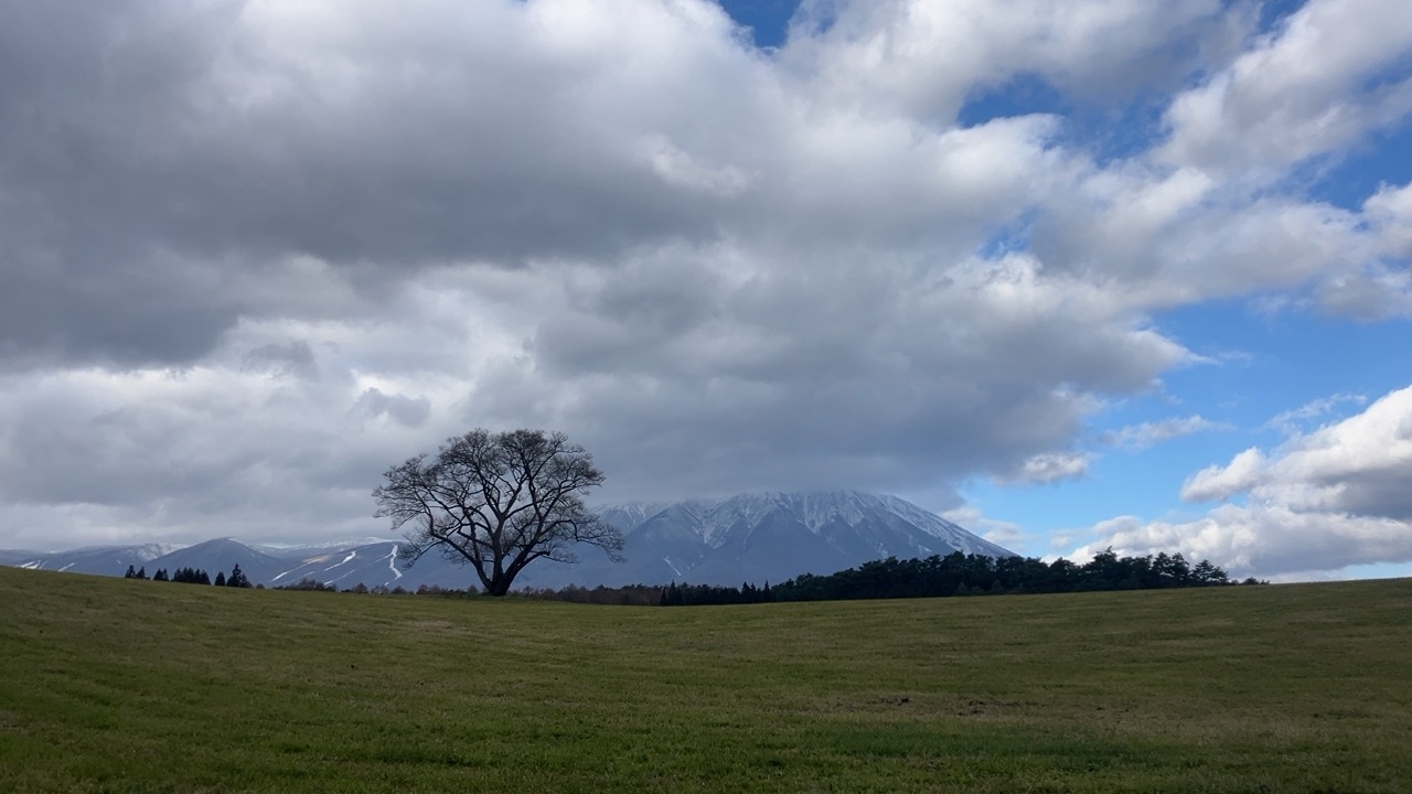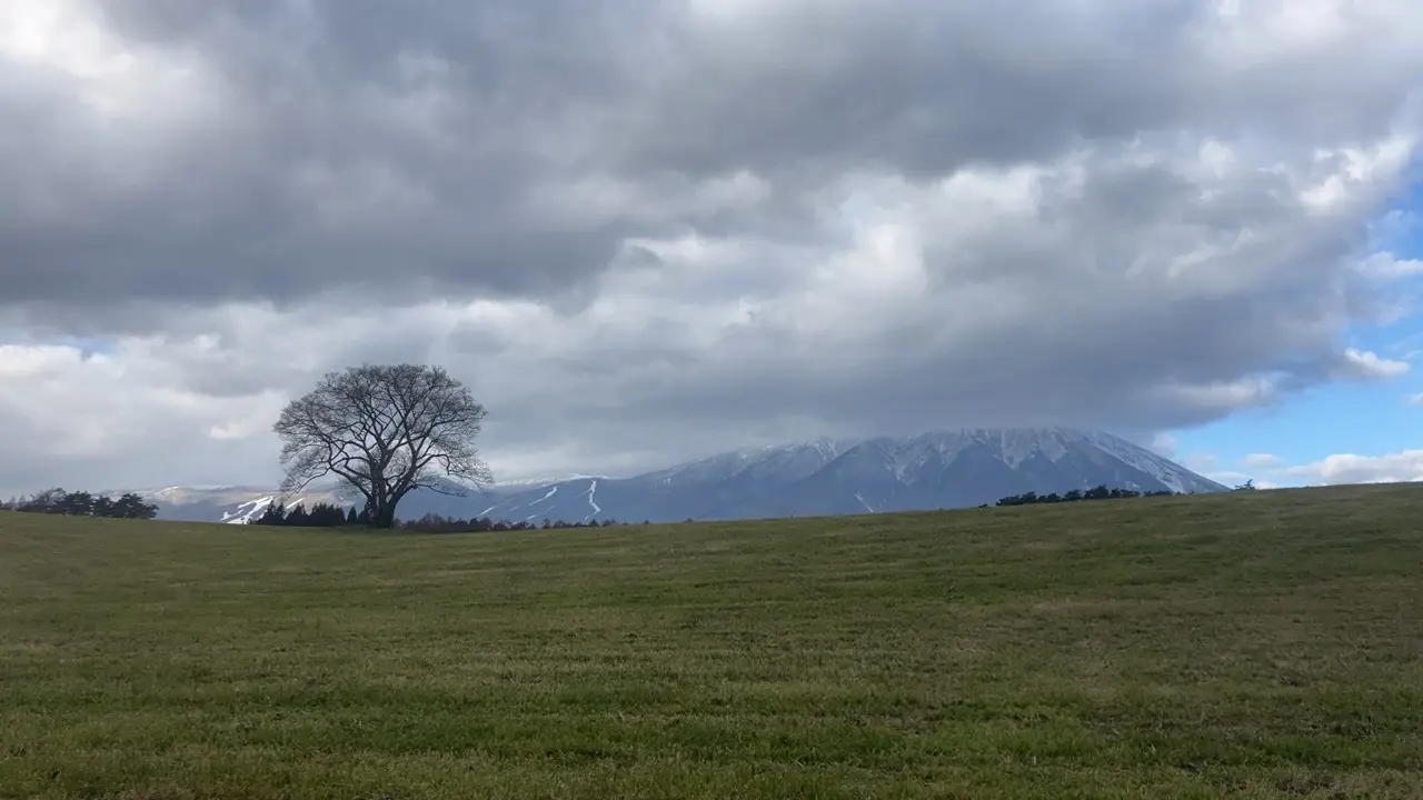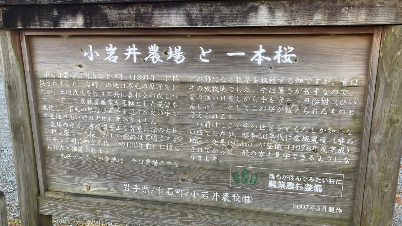 雄大な岩手山を背景に小岩井農場の緑の大地に立つ一本桜.明治40年代に植えられたエドヒガンで、この場所が放牧地だった頃には、夏の日差しから牛を守る日影樹として利用された。桜の開花時には残雪の岩手山とのコントラストのほか、夏から秋、冬へと変化する風景も美しい。