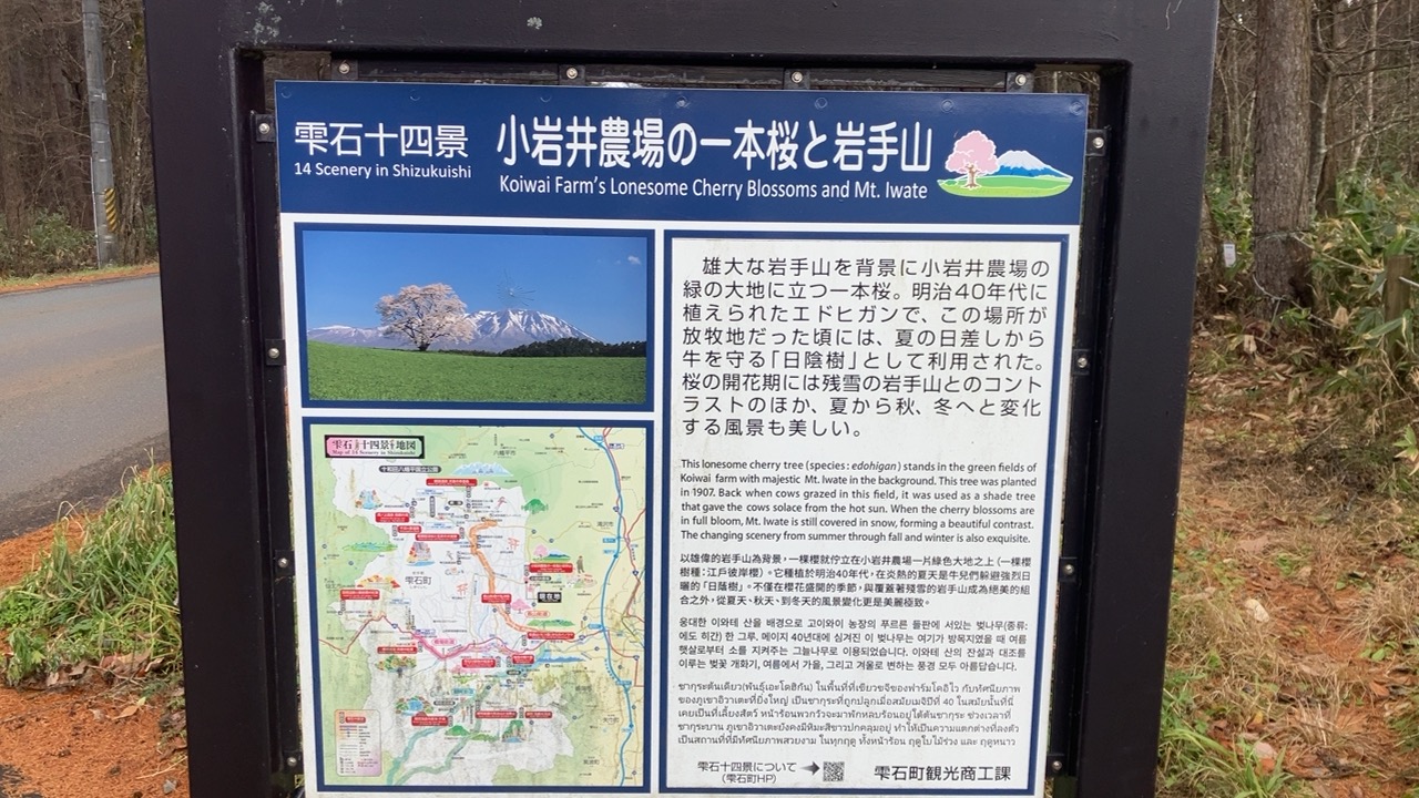 11月後半の三連休で秋田県、岩手県に旅行に行った際に、角館から安比高原への移動中、雫石の小岩井農場にも寄ってみました。こちらでは、岩手山を背景にして、小岩井農場の中に立つ一本桜の雄姿を観ることができます。比嘉愛未さんが主演しているNHKの朝ドラ「どんど晴れ」のオープニング映像の中で使われていたので、この一本桜のことを知りました。地図で確認すると、確かに一本桜の場所が描かれています。ここをカーナビにセットして現地に向かってみました。