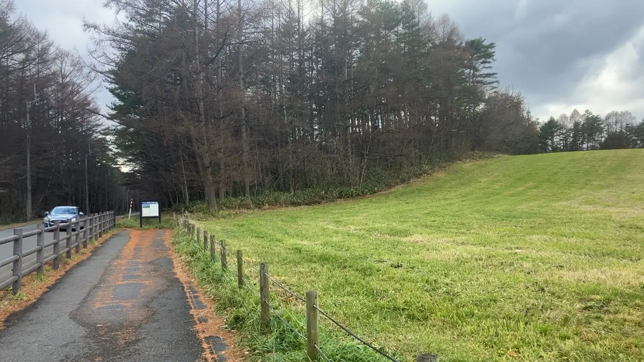 現地に行ってみると、小岩井農場の一本桜を見学するための駐車場まで準備されていました。そちらにクルマを停めました。時期があまり良くなかったことと、この日は一時、雨が降っていたこともあって、ほかにはクルマは停まっていませんでした。