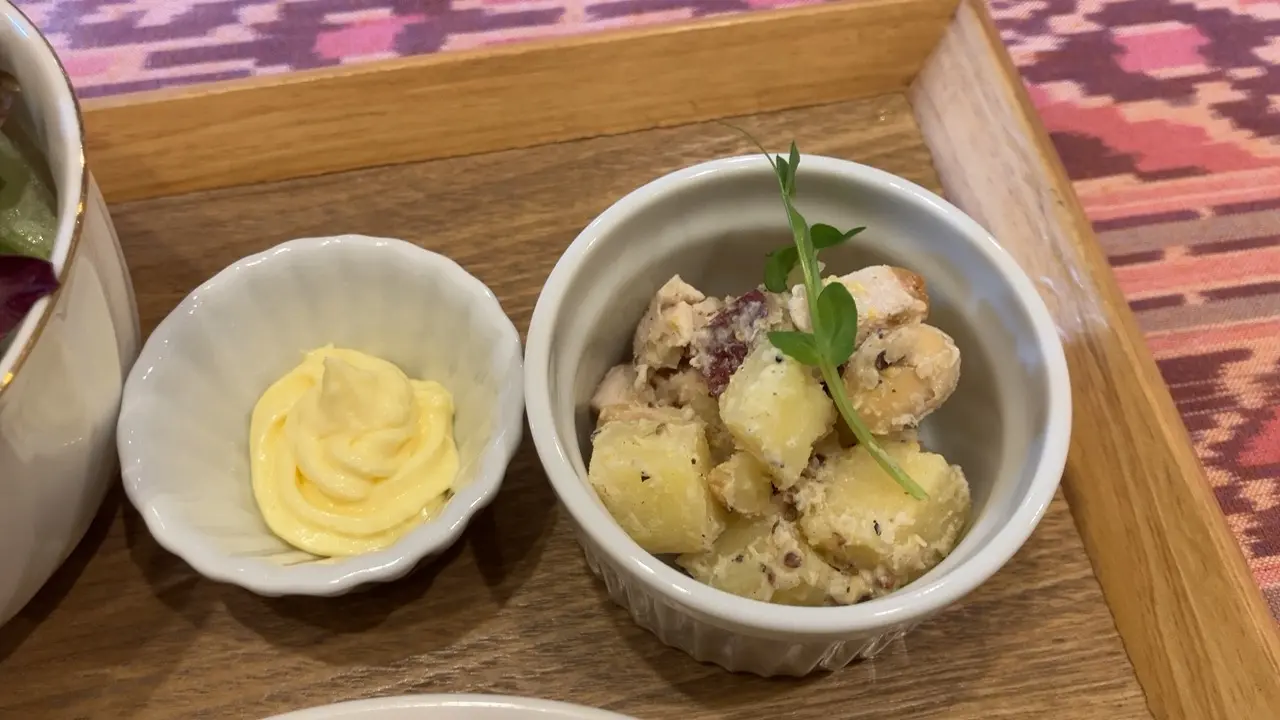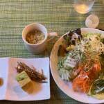 今回は洋プレートと和のお膳を注文してみました。私たちが注文したあと、次のお客さんのときには和のお膳の魚がなくなったので別の魚で作るとお客さんに案内していました。12時前に来るお客さんの数が普段よりも多かったのかもしれません。