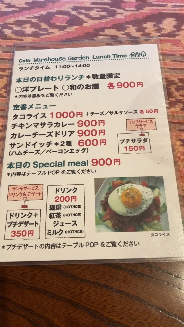 日替わりランチは数量限定、ほかにタコライスやチキンマサラカレー、カレーチーズドリア、サンドイッチ、本日のスペシャルミールなどのレパートリーがあります。