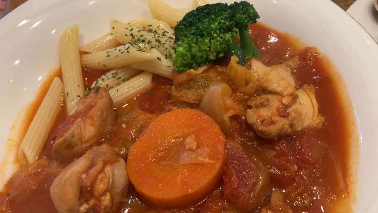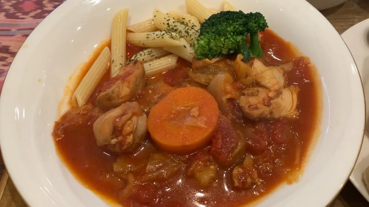 チキンキャベツトマトシチューペンネ添えです。真ん中にアクセントとしてニンジンがのっています。